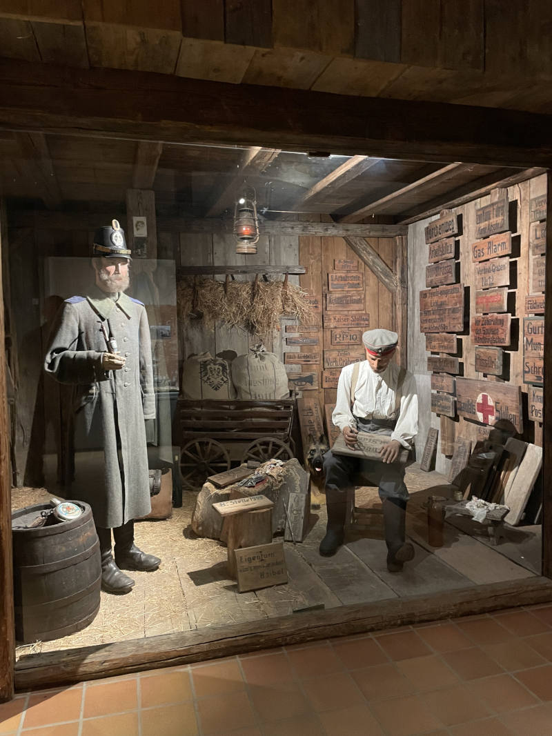A l’étage inférieur, sont présentés les deux adversaires dans leurs équipements de l’époque, ainsi qu’une scène reconstituée d’un poste de secours français. Les vitrines thématiques (l’hiver, l’alimentation en eau, l’atelier du peintre, les animaux, les enfants et la guerre…) sont dédiées à l’uniformologie, l’armement, la vie quotidienne des soldats.