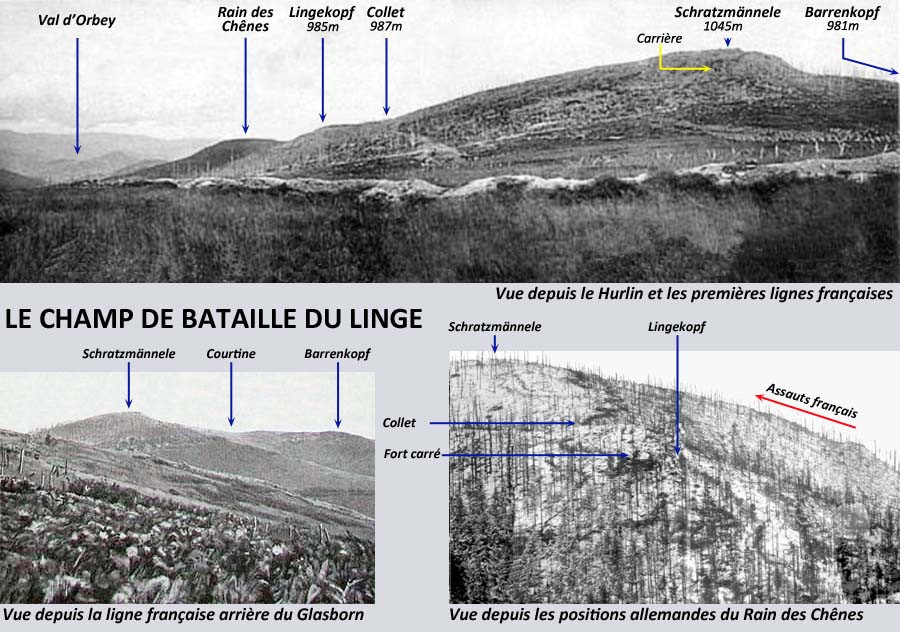 Du côté français, la responsabilité de l’attaque fut confiée à la 129ème Division d’Infanterie, commandée par le Général Nollet. Cette division nouvellement créée comprenait une brigade d’infanterie et la 5ème Brigade de Chasseurs formée essentiellement de jeunes recrues de la classe 1915 dont nombre n’avait jamais connu le feu. La 129ème Division fut renforcée par la 3ème Brigade de Chasseurs Alpins, composée quant à elle de vétérans aguerris par de longs combats dans les Hautes Vosges et en Lorraine, détachée pour l’occasion de la 47ème Division. L’artillerie comprenait des canons de 220 (installés à contrepente de la grande crête des Vosges), 155, 120, 75 et 65 établis en batteries sur les flancs de la grande crête faisant face au chaînon du Linge.